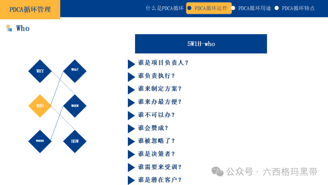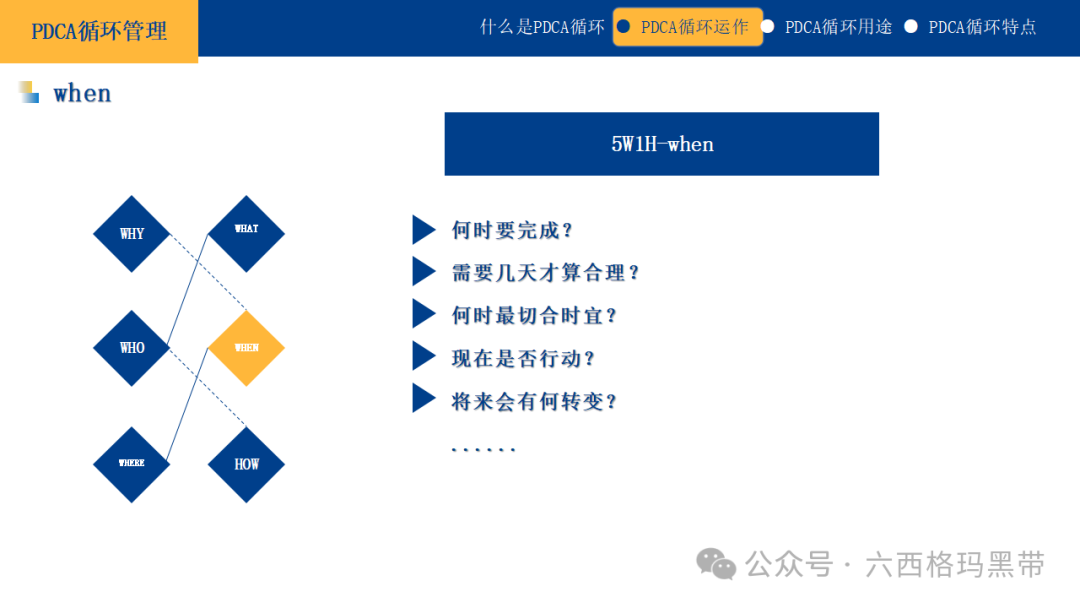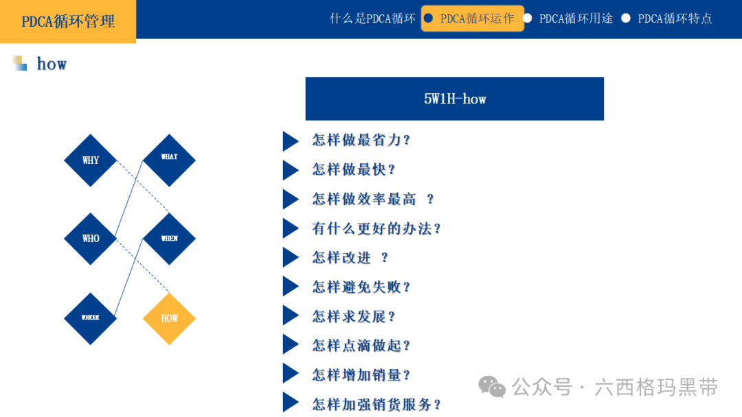 对于改善性计划,可以结合鱼骨图法(因果图法)来进一步分析问题的根源,并制定相应的改善措施。 实施方案及时间计划中的实施方案应具有可操作性和连贯性。可以将大计划分解为若干个小计划或阶段性目标,但每个小计划之间应有逻辑上的联系,共同支撑大计划的实现。同时,应明确每个阶段的时间安排,确保计划能够按时完成。 应有数据可衡量及成果评估计划应包含可量化的指标和成果评估方法。这不仅能够帮助我们在执行过程中跟踪进度,还能在计划结束后对成果进行客观评价。数据化的管理是现代企业管理的重要趋势,它能够使管理更加精准、高效。 思考方法5W1H法5W1H法是一种基本的思考问题和解决问题的方法,它涵盖了问题解决的六个关键方面: