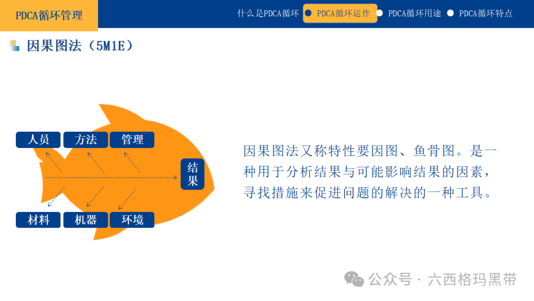 通过5W1H法的系统思考,我们能够更加全面地理解问题,制定出更加有效的解决方案。 因果图法(鱼骨图)因果图法,又称鱼骨图法,是一种用于分析结果与影响因素之间关系的工具。它通过将问题的主要原因(即“鱼头”)和次要原因(即“鱼骨”)以图形化的方式呈现出来,帮助我们直观地识别问题的根源,并找到解决问题的措施。鱼骨图法常用于质量管理、故障分析、项目管理等领域,是PDCA循环中检查阶段的重要工具之一。 PDCA循环的特点PDCA循环作为一种科学的管理方法,具有以下几个显著的特点: 大环套小环PDCA循环是一个层级结构,大循环中可以包含多个小循环。每个小循环都是一个完整的PDCA过程,它们相互独立,但又服务于大循环的目标。这种层级结构使得PDCA循环能够灵活地应用于不同层级的管理活动中,从组织战略到具体任务,都可以找到合适的循环层级。 小环保大环在PDCA循环中,小循环的成功是实现大循环目标的基础。每个小循环都应对其所在的大循环负责,确保其活动与大循环的目标保持一致。通过不断地优化小循环,可以推动大循环的持续改进和提升。 互相促进PDCA循环的各个阶段不是孤立的,而是相互关联、相互促进的。计划阶段为执行阶段提供了方向和依据;执行阶段将计划转化为实际行动;检查阶段对执行结果进行评估和反馈;修正阶段则根据反馈对计划进行调整和优化。这四个阶段形成一个闭环系统,共同推动组织的持续改进和发展。 推动大循环PDCA循环的最终目的是通过不断的迭代和改进,推动整个组织或项目的大循环向前发展。每一个小循环的完成,都是对大循环目标的一次逼近。随着PDCA循环的不断进行,组织能够逐步积累经验,优化流程,提升能力,最终实现战略目标和持续发展。