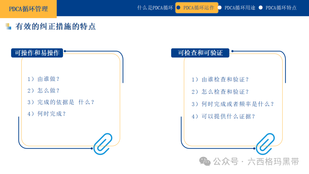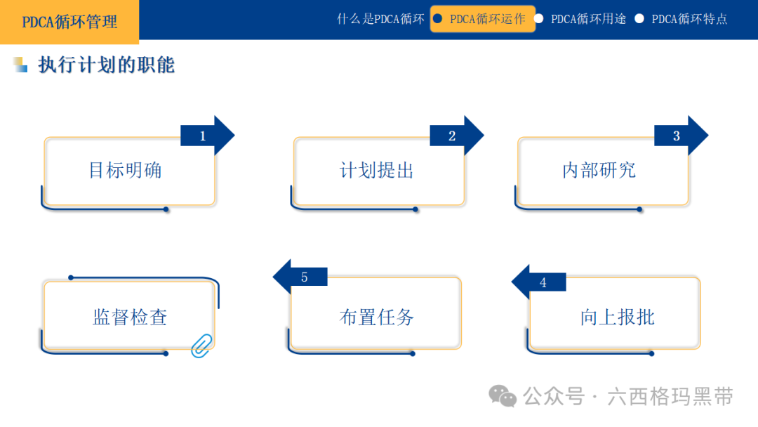 PDCA循环的实践价值持续改进的文化PDCA循环不仅仅是一种管理工具,它更是一种促进组织内部形成持续改进文化的驱动力。通过不断地计划、执行、检查和修正,组织能够培养出一种对现状永不满足、对未来持续探索的态度,鼓励员工主动发现问题、提出改进意见,从而形成一种积极向上的工作氛围。 增强应变能力在快速变化的市场环境中,PDCA循环帮助组织增强了对外部变化的敏感度和响应速度。通过定期的评估和修正,组织能够迅速调整策略,适应新的市场需求或应对突发状况,确保在竞争激烈的环境中保持领先地位。 促进团队协作PDCA循环的实施需要跨部门、跨职能的紧密合作。在计划阶段,团队成员共同参与目标设定和方案制定;在执行阶段,各自承担责任,协同工作;在检查和修正阶段,共同分析成果,分享经验教训。这一过程不仅加强了团队成员之间的沟通与协作,还促进了知识共享和团队凝聚力的提升。 提升决策质量PDCA循环强调基于数据和事实的决策。通过系统的数据收集、分析和反馈,管理者能够更加准确地了解实际情况,做出更加科学、合理的决策。同时,循环过程中的持续学习和经验积累,也为未来的决策提供了宝贵的参考依据。 实现战略目标将PDCA循环应用于战略层面,可以帮助组织将长期愿景分解为短期可实现的目标,并通过持续的循环迭代,逐步逼近并最终实现战略目标。这一过程不仅确保了战略的有效落地,还促进了组织能力的持续提升,为长期发展奠定坚实基础。 做计划的注意事项在PDCA循环中,计划阶段是整个循环的基石,一个周密的计划能够为后续的执行、检查和修正提供清晰的方向和坚实的基础。因此,在制定计划时,需要特别注意以下几个方面: 认清目的首先,必须明确计划的目的,这是计划制定的出发点和归宿。计划项目应紧密围绕组织或个人的长期目标展开,确保每一项计划都是对实现这些目标的有效支撑。同时,计划目标应具体、可量化,以便于后续的跟踪和评估。 充分掌握相关事项在制定计划之前,需要对现状进行全面、深入的分析。这包括了解组织内部的资源状况、能力水平,以及外部环境的机遇与挑战。只有充分掌握相关事项,才能制定出既符合实际又具有前瞻性的计划。 以5W2H法思考5W2H法是一种有效的思考工具,它帮助我们从多个维度审视计划,确保其完整性和可行性。具体来说,就是回答以下问题: