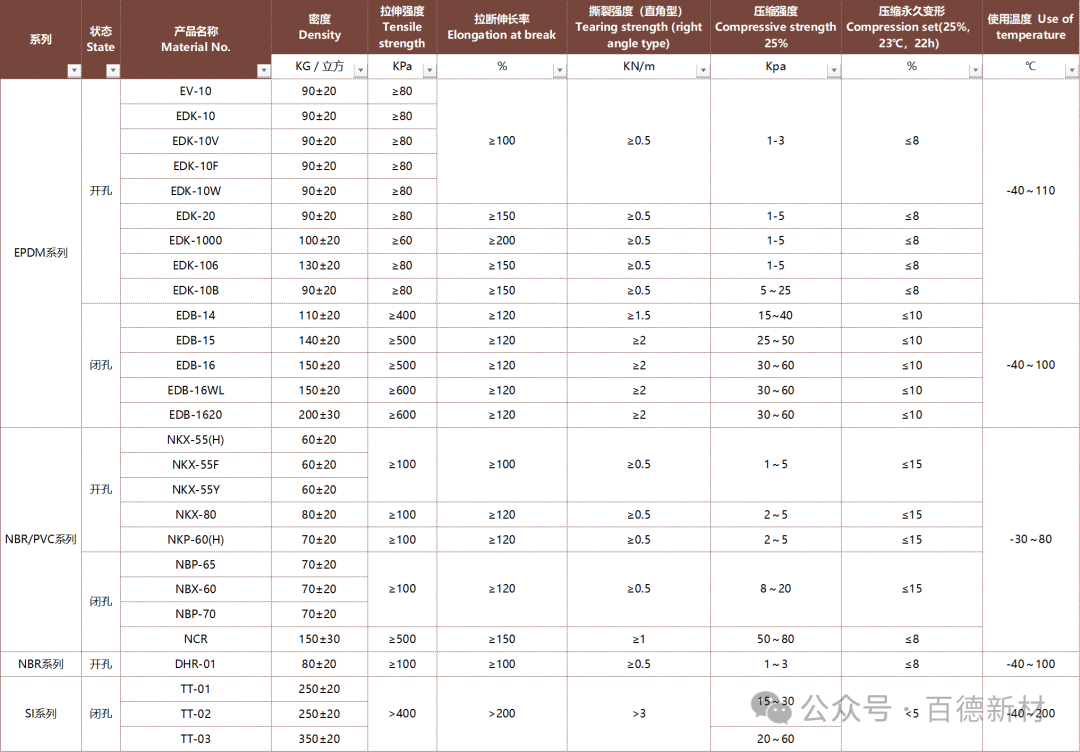 泡棉材料对比表