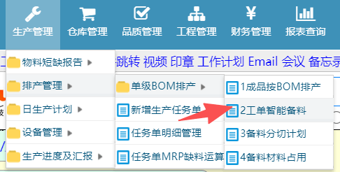 操作步骤:生产管理-单级BOM排产-工单智能备料