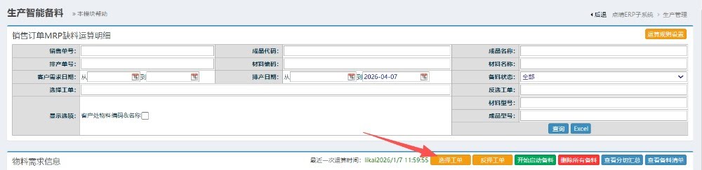 进入界面后,选择需要备料的工单,点击“选择工单”按钮