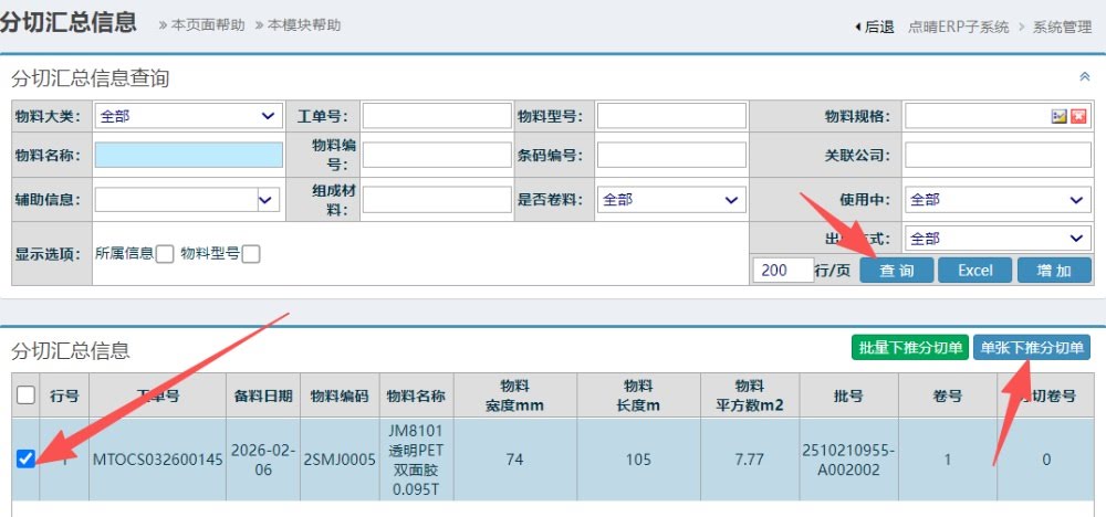 进入界面后,选中需要下推形成的分切明细,点击“单张下推分切单”按钮