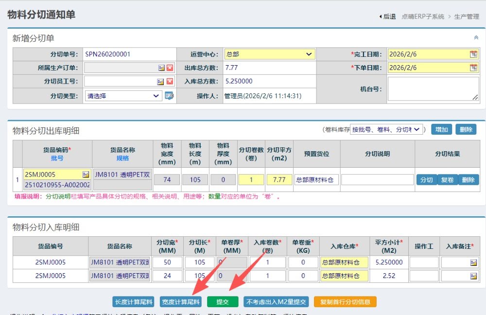进入后,点击按宽度计算尾料,然后提交,完成操作