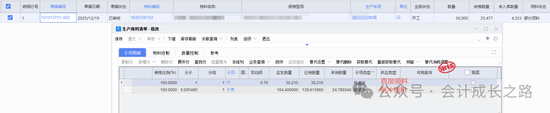 2、金蝶云星空物料计价方法设置:成本管理-存货核算-核算范围-新增设置。3、每个存货价值区域都可有其独立的计价方式,比如某核算范围的计价方法是加权平均、但该核算范围下有某类特殊物料要按移动平均计价,则可以采用此物料计价方法进行设置(一般不建议使用)。4、物料属性在新建物料时定义,目前金蝶云星空不支持自定义修改添加物料属性,只能使用标准系统预置的物料属性,强行自定义添加会导致该属性物料无法正常参与存货核算。5、物料计价方法变更: 主要是指企业采用某计价方法核算一段时间后,因管理或对外报告的需要需采用另一种计价方法进行核算,这样就需通过物料计价方法变更对现有计价方法进行变更。变更之后无法反审核删除,需谨慎使用。6、金蝶云星空目前没有个别计价法,要达到个别计价法功能,需要借助批号来执行,在每个物料的物料维度库存属性批号行勾选影响出库成本可以实现。通过生产订单下的生产领料单、生产补料单、生产退料单归集(投入金额),根据BOM表定额耗用量在完工产品和在产品之间分配。例如:本期生产数量30000只,合理损耗210只,直接领料金额25483.91,倒冲领料金额2409.27(完工数量25477只)间接领料分摊金额212.3(完工产品承担)本期投入直接材料金额=25483.91+2409.27=27893.18;本期间接材料金额=212.3,全部分摊到完工产品。本期完工25477只,合理损耗=25477/30000*210=178只;(25477+178)/30210*25483.91+2409.27=24050.77;期末在产品4523只直接材料金额=27893.18-24050.77=3842.41。本实例涉及了多种领料方式、合理损耗、共耗材料分摊,是比较复杂的一种分配过程。实际操作中物料材料金额分配不是课本中单纯的根据总金额/总数量*入库数量或者未入库数量得到的。需要从业务逻辑多方面考量。