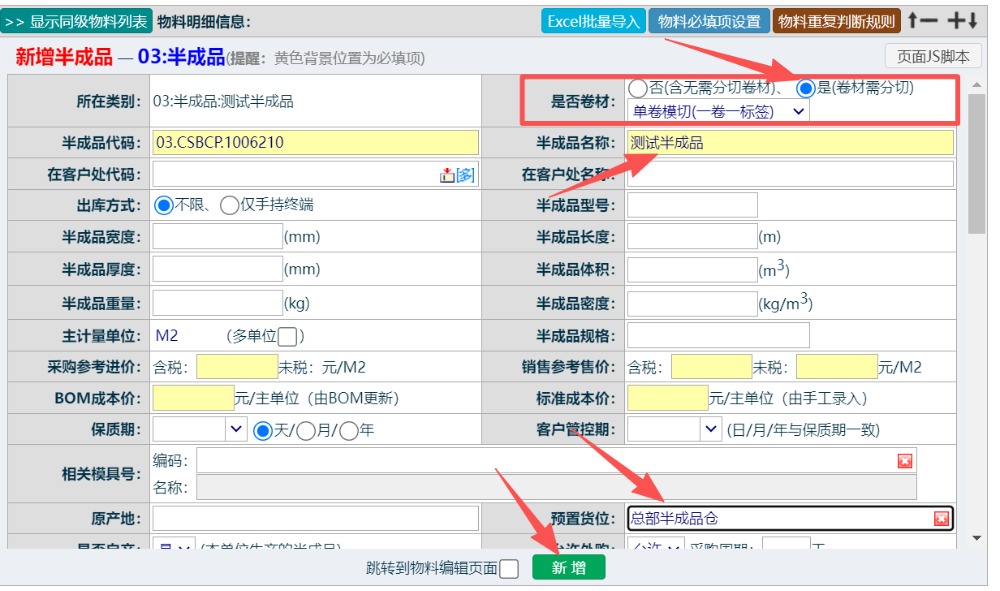 选中对应的类别后,进入到资料输入界面,注意:是否卷材栏位选“是”,输入其他相关信息,点击“新增”完成,如下图所示: