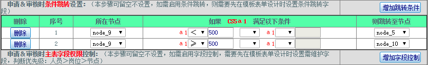 设置步骤:点击“增加跳转条件”按钮——选择所在节点——选择跳转至节点——编辑字段条件(a1<500);如下图所示: