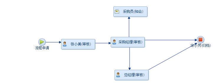 路线一:申请——审核(张小美)——审核(采购经理)——归档(宋小芳)