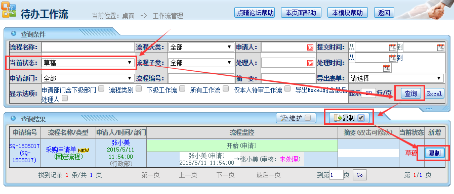 操作步骤:登陆张小美账号——工作流管理——待办工作流——选择“当前状态”为草稿——查询——复制;如下图所示: