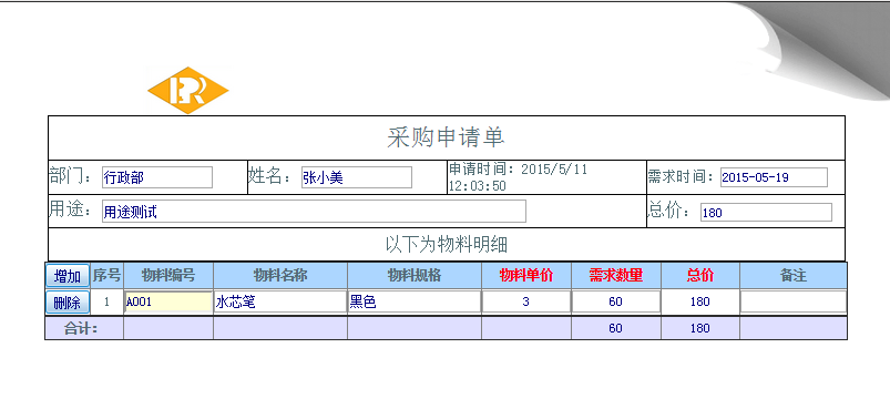 操作步骤:登陆点晴oa ——工作流申请——选择“采购申请单”进行申请;填好数据后如下图所示:
