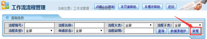 操作步骤:工作流管理——流程管理——新增;如图: