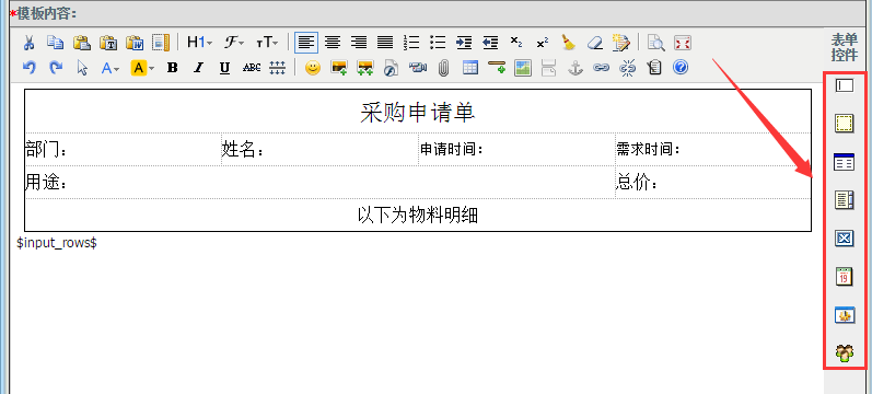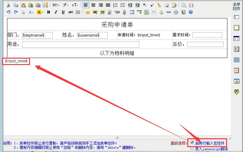 1、点晴OA中没有提供直接的附件上传控件,需要在申请的表单中插入富文本控件,用户申请工作流时,通过富文本编辑器插入附件的方式实现附件的上传。注意,富文本控件要放在表格中,不要单独放在一行,否则将导致审核时,审核人在IE浏览器中将无法看到附件: