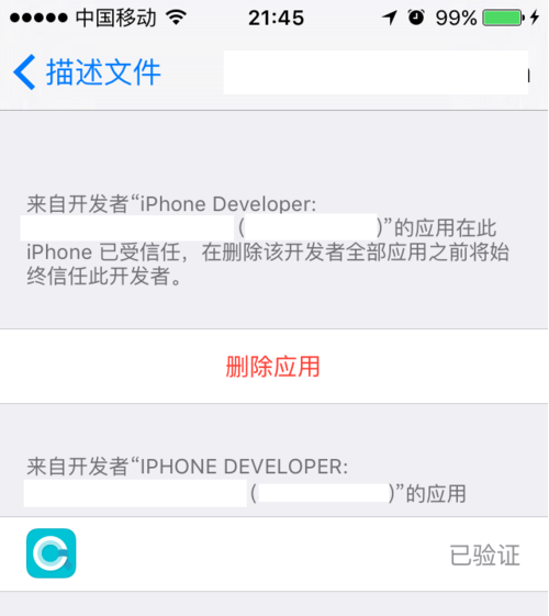 信任完以后,发现中间那一栏“信息(【我的苹果账号或者其他的开发商】)”,变成了“删除应用”,表示已经信任配置成功了。现在就可以按Home键返回桌面,打开“点晴信息通”应用,进行测试和使用了。