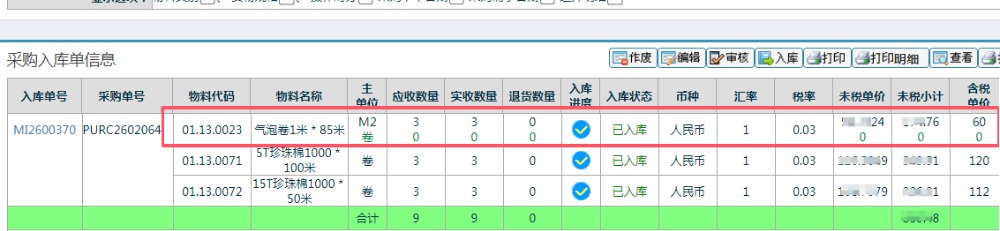 这个物料启用了多单位采购,可以看到上面按卷采购的单价=0,应该采用按照M2价格进行对账即可。
