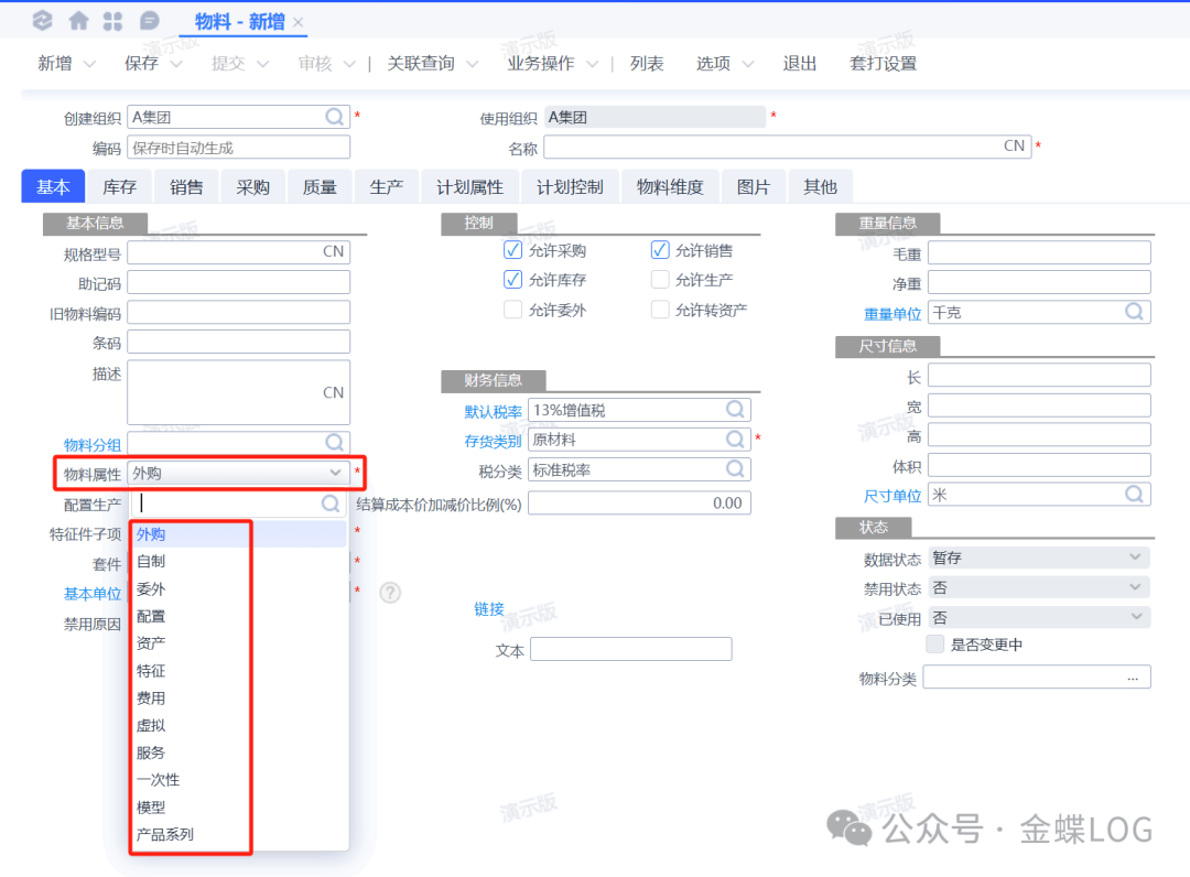 Q问题描述在新增物料的时候,物料属性有12种值提供选择,分别都是什么作用?学完本篇文章,您将学会:①物料属性值与它的业务控制。②12种物料属性介绍。③参与计划运算和存货核算的属性