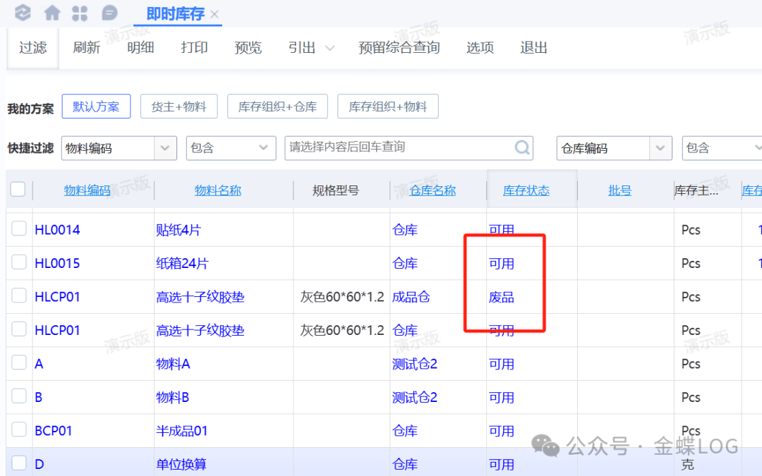 Q问题描述在做单据或者查询库存时,都有一个库存状态字段,那么这个库存状态的值到底有什么用?学完本篇文章,您将学会:①仓库的库存状态类型有哪些?②库存状态控制类型有什么用?③如何默认仓库的库存状态?A问题解答一、仓库的库存状态类型系统默认的库存状态类型一共有9个:可用、待检、冻结、退回冻结、在途、收货冻结、废品、不良、不...